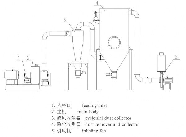 由定量喂料系統把物料輸送到粉碎腔內,物料在高速旋轉的轉子與齒襯的定子之間受到沖擊和剪切,粉碎后的物料在氣流的帶動下進入分級區,合格的物料通過旋風和除塵器收集,不合格的物料重新返回到粉碎區進行粉碎,特殊的設計使物料充分的分散,充分的粉碎,節約了粉碎能,提高了粉碎效率。