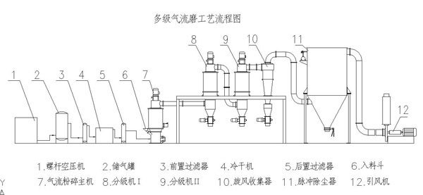 氣流磨的工作原理,是以高壓氣體產(chǎn)生得超音速氣流帶動物料進行自身碰撞粉碎。同時磨腔內(nèi)的分級器對所粉碎物料分級,從而得到所需粒度產(chǎn)品。其粗粒留在腔內(nèi)繼續(xù)粉碎。